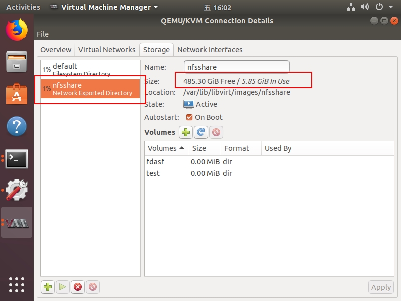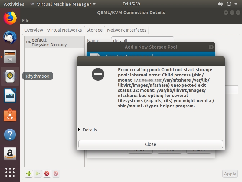 在Virtual Machine Manager > Edit > Connection Details > Storage 增加 netfs/NFS 时出现如下报错: