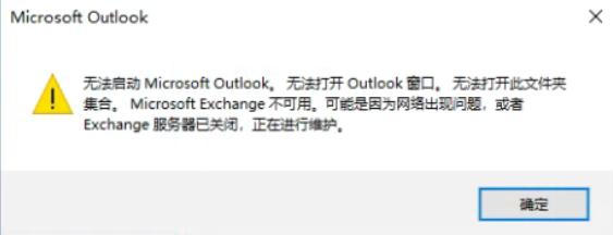报错信息:无法启动Microsoft Outlook。无法打开Outlook窗口。无法打开此文件夹集合。Microsoft Exchange不可用。可能是因为网络出现问题,或者Exchange服务器已关闭,正在进行维护。