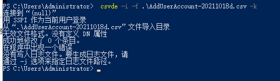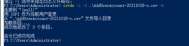 csvde -i -f .\AddUserAccount-20211018-c.csv -k