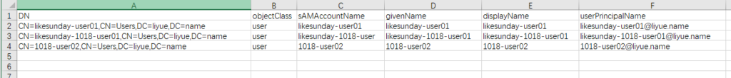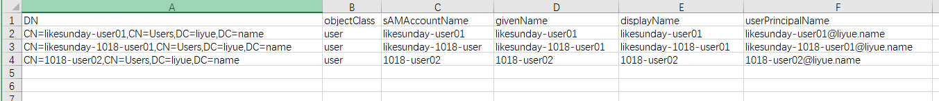 | DN | objectClass | sAMAccountName | givenName | displayName | userPrincipalName |