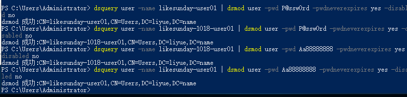 dsquery user -name likesunday-user01 | dsmod user -pwd Aa88888888 -pwdneverexpires yes -disabled no