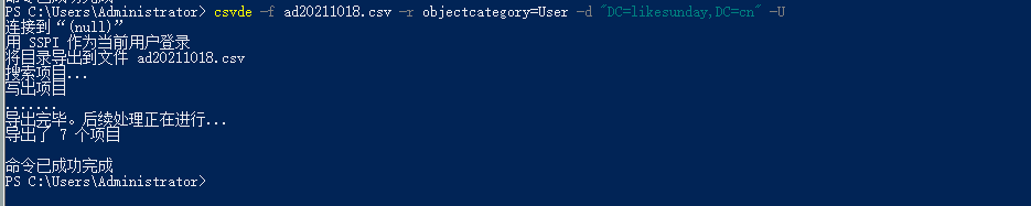 csvde -f ad20211018.csv -r objectcategory=User -d "DC=likesunday,DC=cn" -U