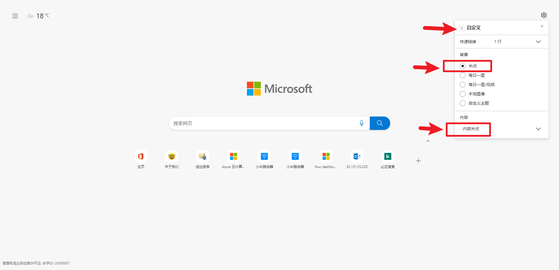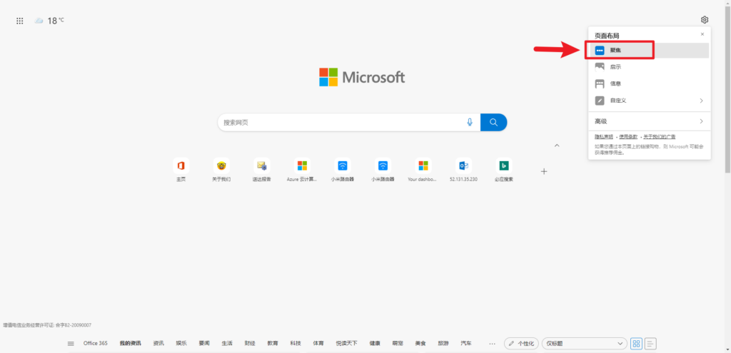 关闭Edge浏览器广告 大家启动Edge浏览器时会出现链接导航、我的兴趣、天气这些,如果不想看到,你可以参考以下方法全部关闭掉。 1. 点设置(右上角齿轮) 2.点聚焦 3.点自定义,背景 > 关闭,内容 > 内容关闭 4.设置完成,跟Google浏览器一样简洁干净了: ) Post Views: 4