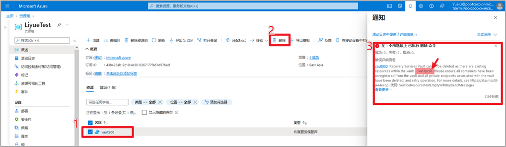删除恢复服务保管库时出现报错: