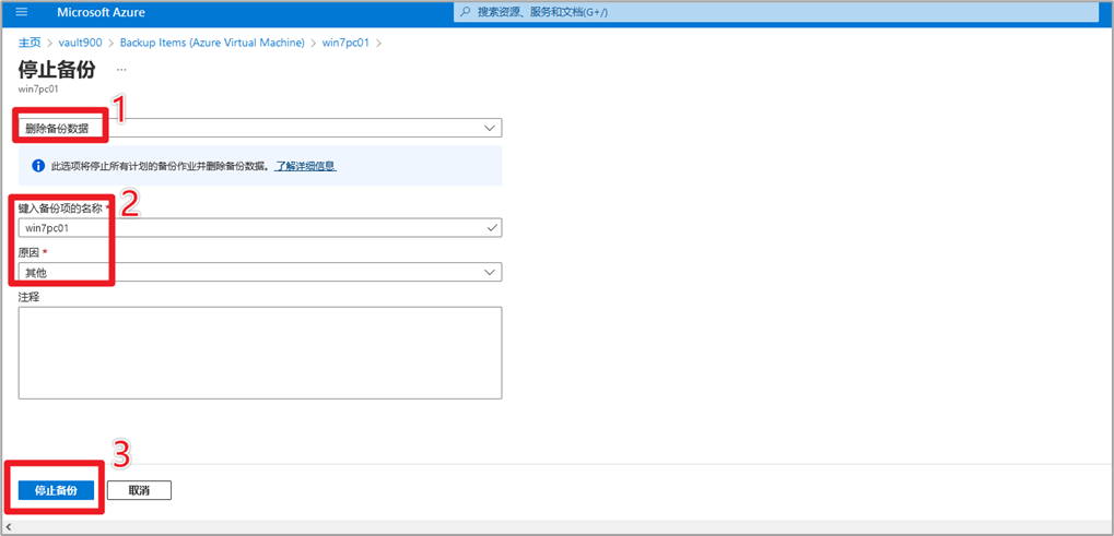 6 选择删除备份数据 > 输入备份项的名称 > 选择原因 > 点击停止备份