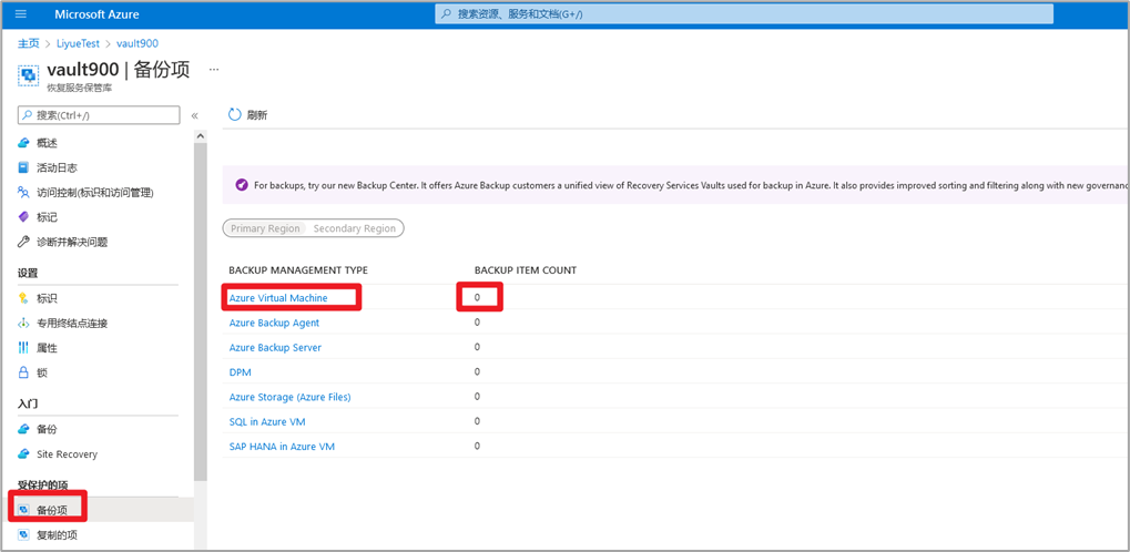 3 左侧菜单 > 备份项 > 可以看到有1台虚拟机的备份项 > 点击 Azure Virtual Machine