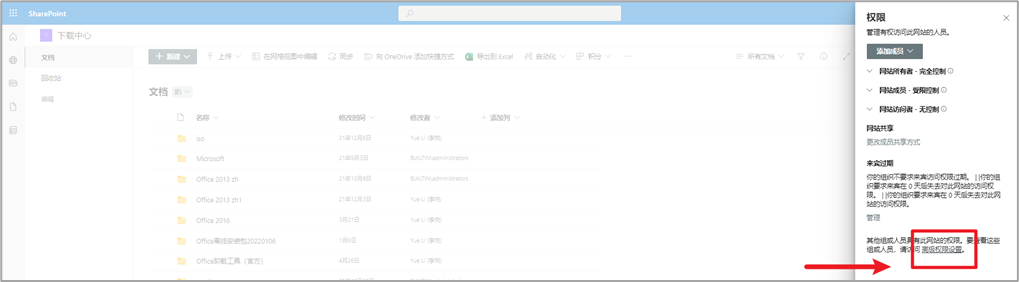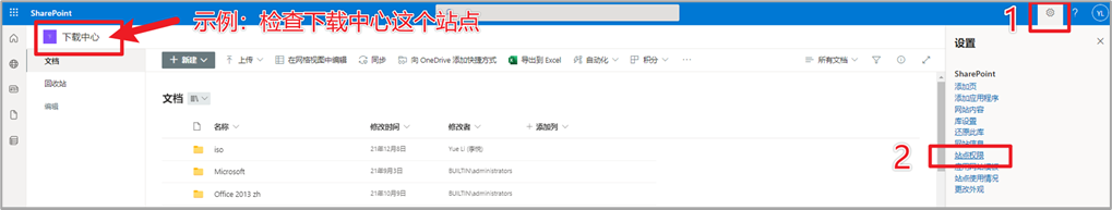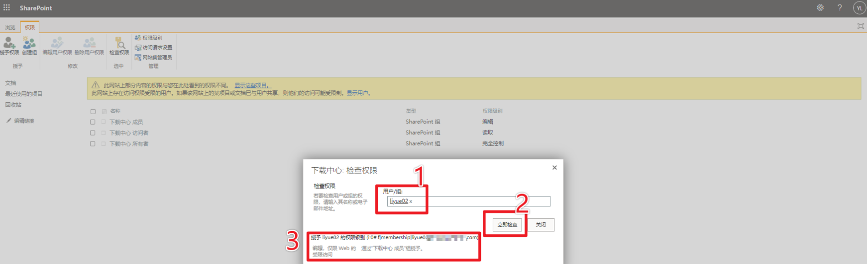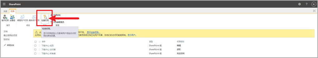 检查用户SharePoint权限 站点所有者进入SharePoint站点 > 右上角齿轮 > 站点权限 点击 高级权限设置 链接 点击 检查权限 按钮 输入用户邮箱地址 > 点击立即检查 > 即可显示用户拥有的权限(受限访问) Post Views: 1