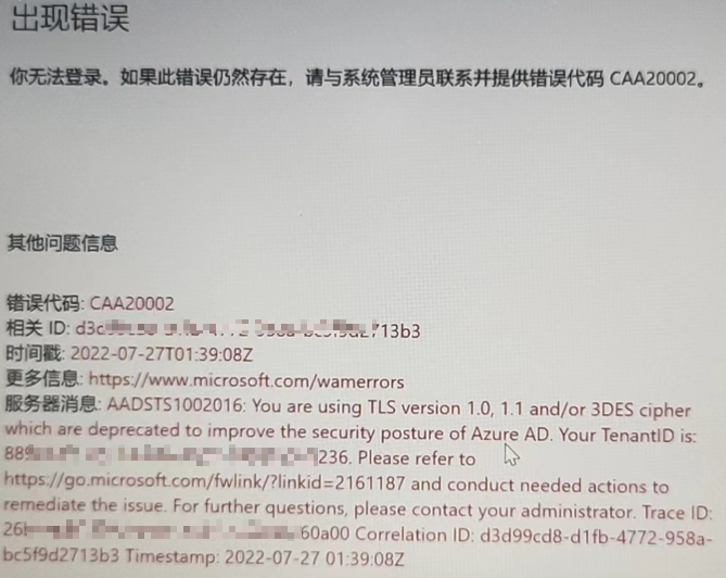 出现错误:你无法登录。如果此错误仍然存在,请与系统管理员联系并提供错误代码CAA20002。