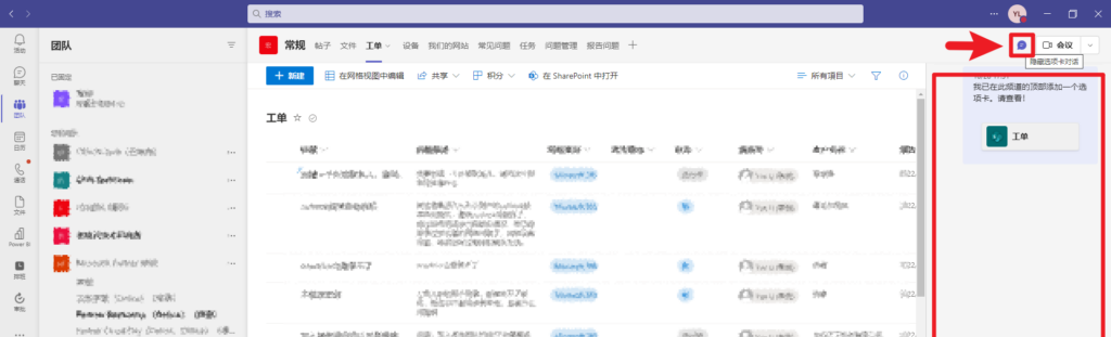 默认情况下,团队中选项卡内容右侧会弹出一个对话窗口,如果不喜欢,可以参考下图隐藏起来。