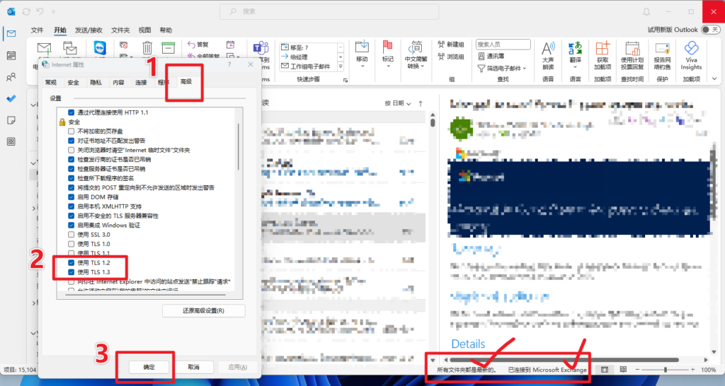 Outlook 显示“正在尝试连接”的解决方法 Windows 开始按钮 > 搜索 Internet 选项 > 打开 Internet 选项 高级 > 勾选:使用LTS 1.2、1.3 > 确定 重新打开Outlook 即显示“已连接到Microsoft Exchange” Post Views: 3