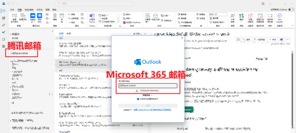 工作需要,想验证Outlook是否允许添加相同地址的邮箱(账号相同,邮箱服务商不同)。