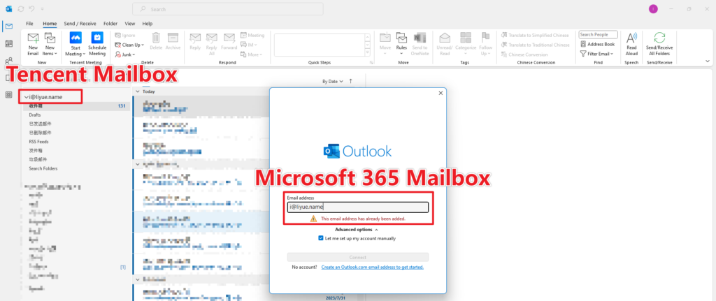 Outlook cannot add a mailbox with the same name For work needs, I want to verify whether Outlook allows adding mailboxs with the same address (same account, different mailbox service providers). Test result: not supported Post Views: 2