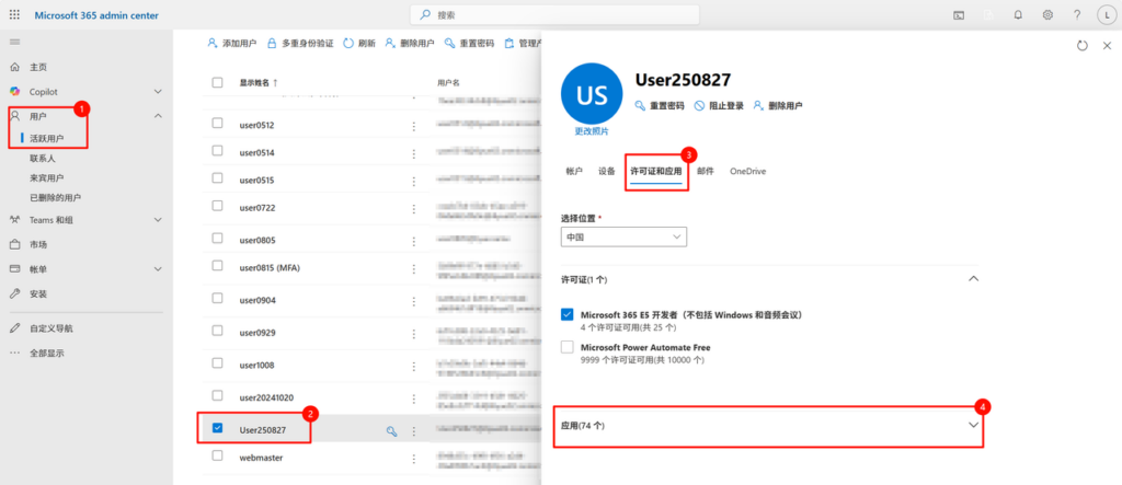Microsoft 365 管理中心 > 用户 > 活跃用户 > 勾选用户 > 许可证和应用 > 展开应用