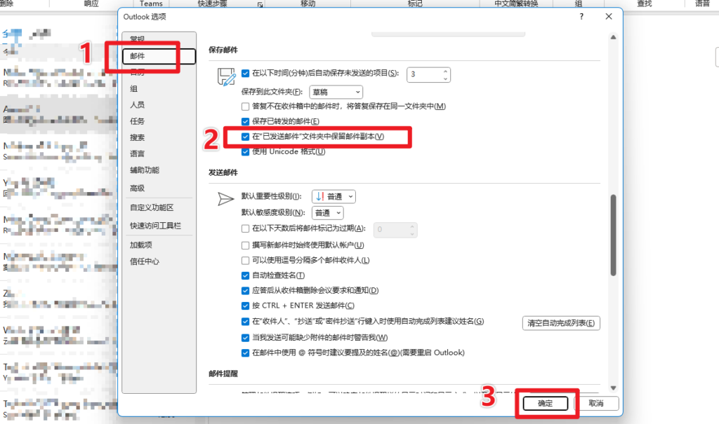 邮件 > 在”已发送邮件“文件夹中保留邮件副本 > 确定