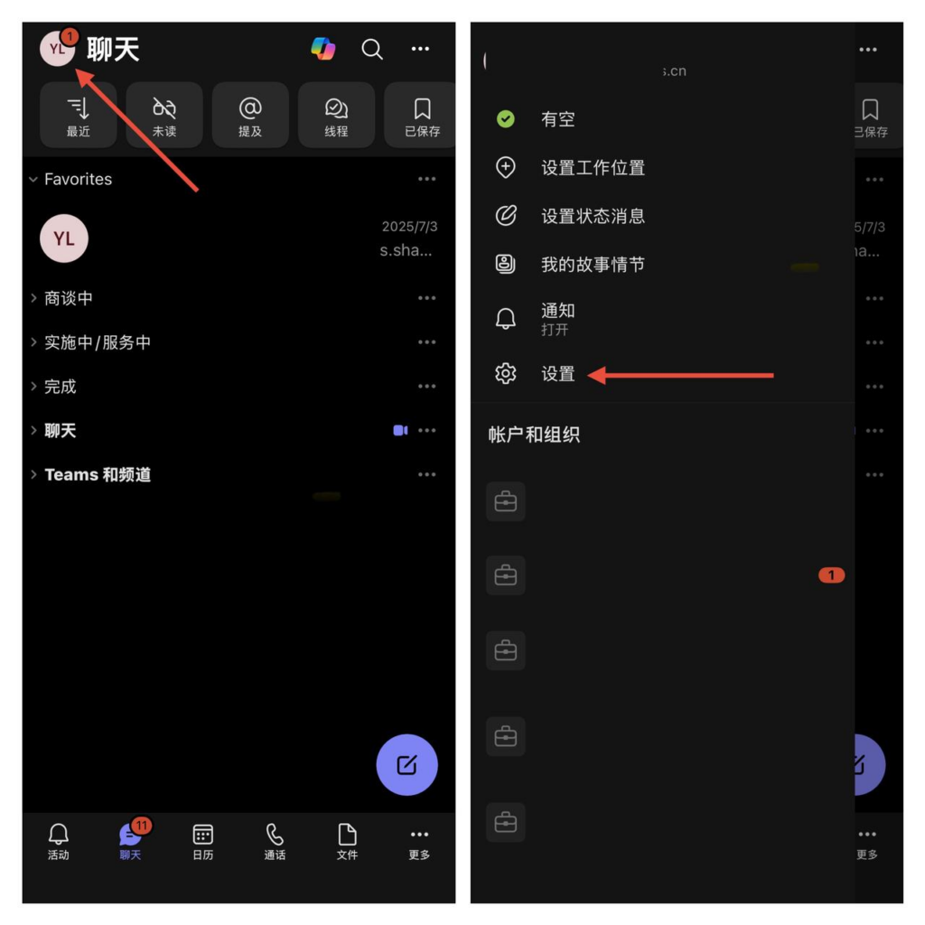 手机Teams > 左上角头像 > 设置