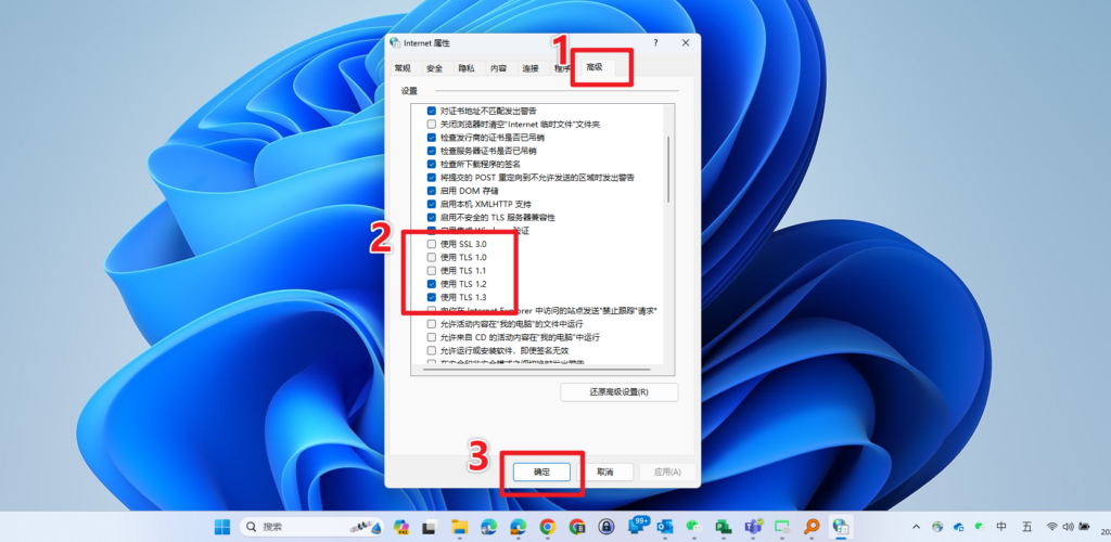 Outlook和OneDrive网络问题(使用TLS 1.2和1.3) 示例为Windows 11,Windows 10系统可参考 搜索 > Internet选项 高级 > 只勾选 使用TLS 1.2 和使用TLS 1.3 > 确定 Post Views: 19