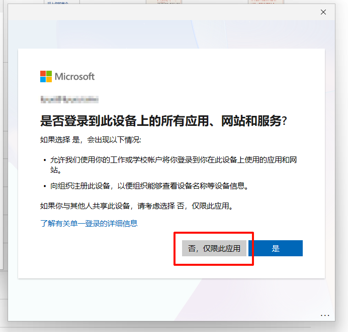 临时使用、测试账号,请点击 否,仅限此应用