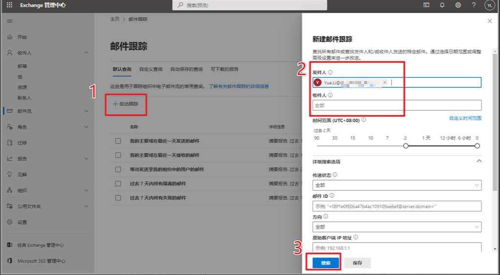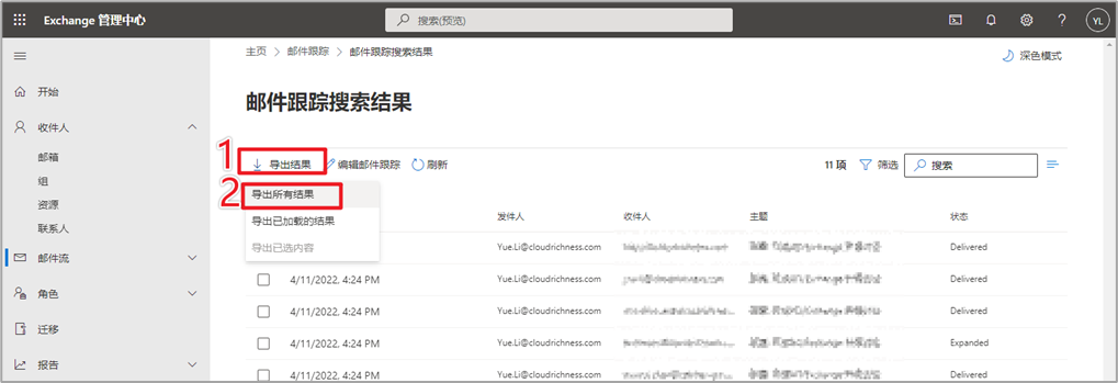 邮件跟踪(Microsoft 365) 请根据购买的版本选择网址 国际版 https://admin.microsoft.com 中国版 https://portal.partner.microsoftonline.cn/AdminPortal/ Microsoft 365管理中心 > 安全 左下角 > Exchange邮件跟踪 启动跟踪 > 设置跟踪条件 > 搜索 *注:下图示例为发件人在2天内所有收发邮件。 查看结果,点记录即可查看邮件信息。 也可以导出所有结果(见下图) Post Views: 16