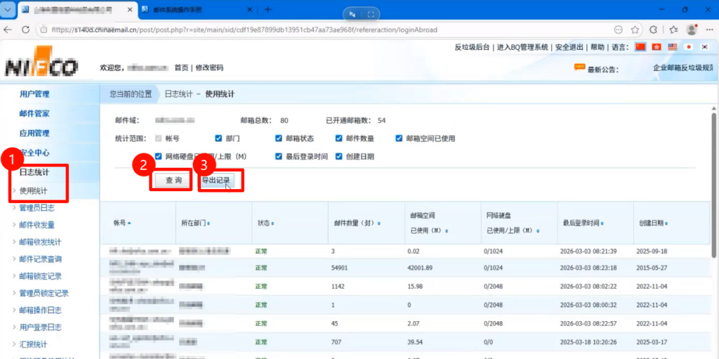 Bossmail 导出邮箱使用情况(中资源老板邮局) 进入Bossmail 后台 https://www.chinaemail.cn 左侧菜单 > 日志统计 > 使用统计 > 查询 > 导出记录 Post Views: 10