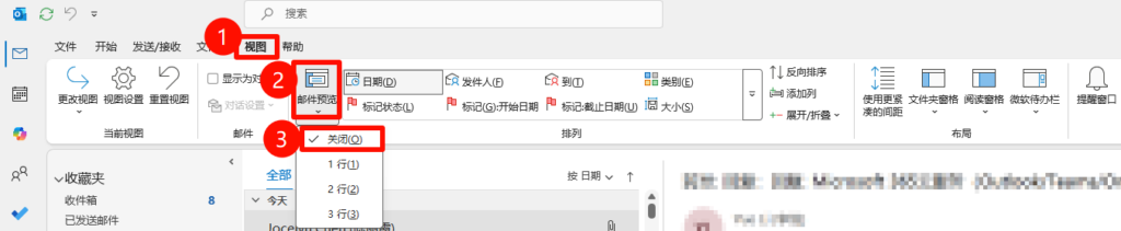 Outlook 客户端 > 视图 > 邮件预览 > 关闭