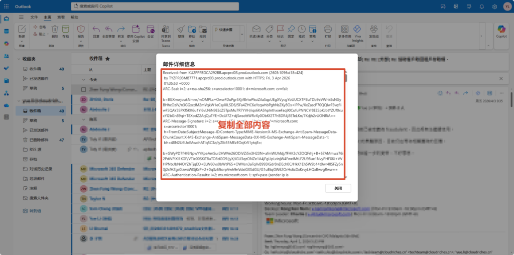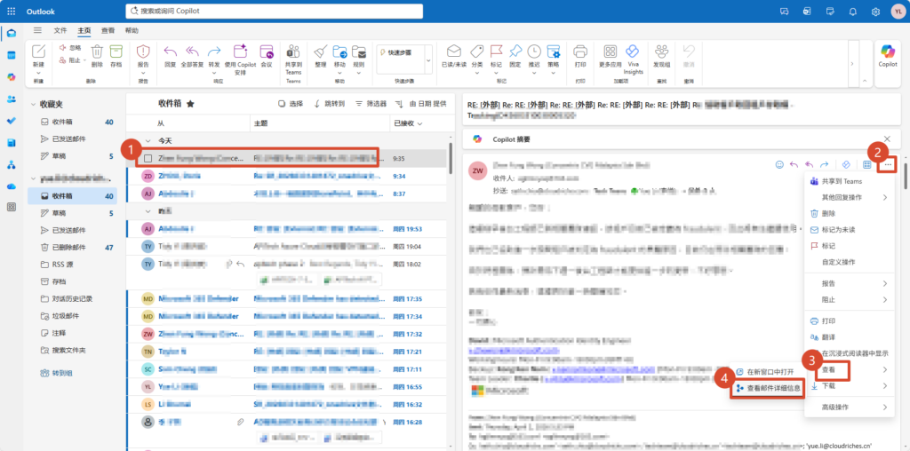 进入网页邮箱 > 点开邮件 > …(三个点) > 查看 > 查看邮件详细信息