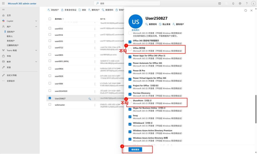 找到 Office 网页版 > 找到SharePoint(计划1/2) > 取消勾选 > 保存