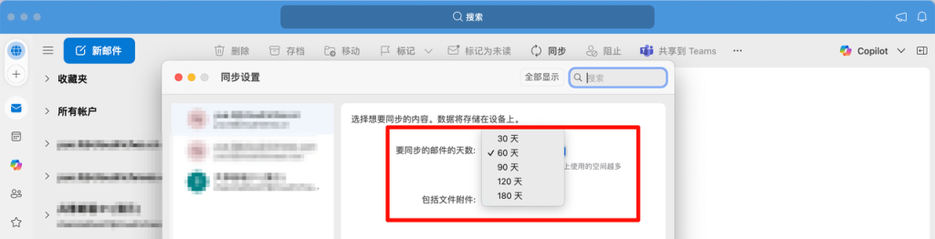 要同步的邮件的天数 > 选择需要同步的天数 > 完成
