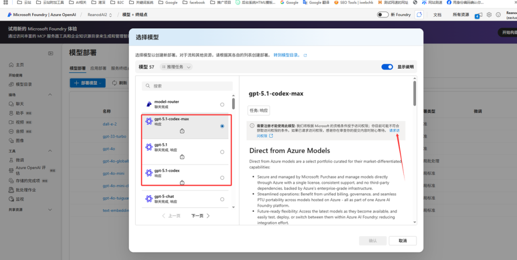 请求访问权限(Azure OpenAI 新模型) 方法一:点页面上的 请求访问权限 链接 方法二:复制以下链接,粘贴在浏览器打开 https://customervoice.microsoft.com/Pages/ResponsePage.aspx?id=v4j5cvGGr0GRqy180BHbR7en2Ais5pxKtso_Pz4b1_xUQ1VGQUEzRlBIMVU2UFlHSFpSNkpOR0paRSQlQCN0PWcu 注1:邮箱地址请填写企业邮箱不要使用个人邮箱 注2:填完后微软会立马回执您一个确认申请邮件,不用回复,继续等待微软处理即可 Post Views: 30